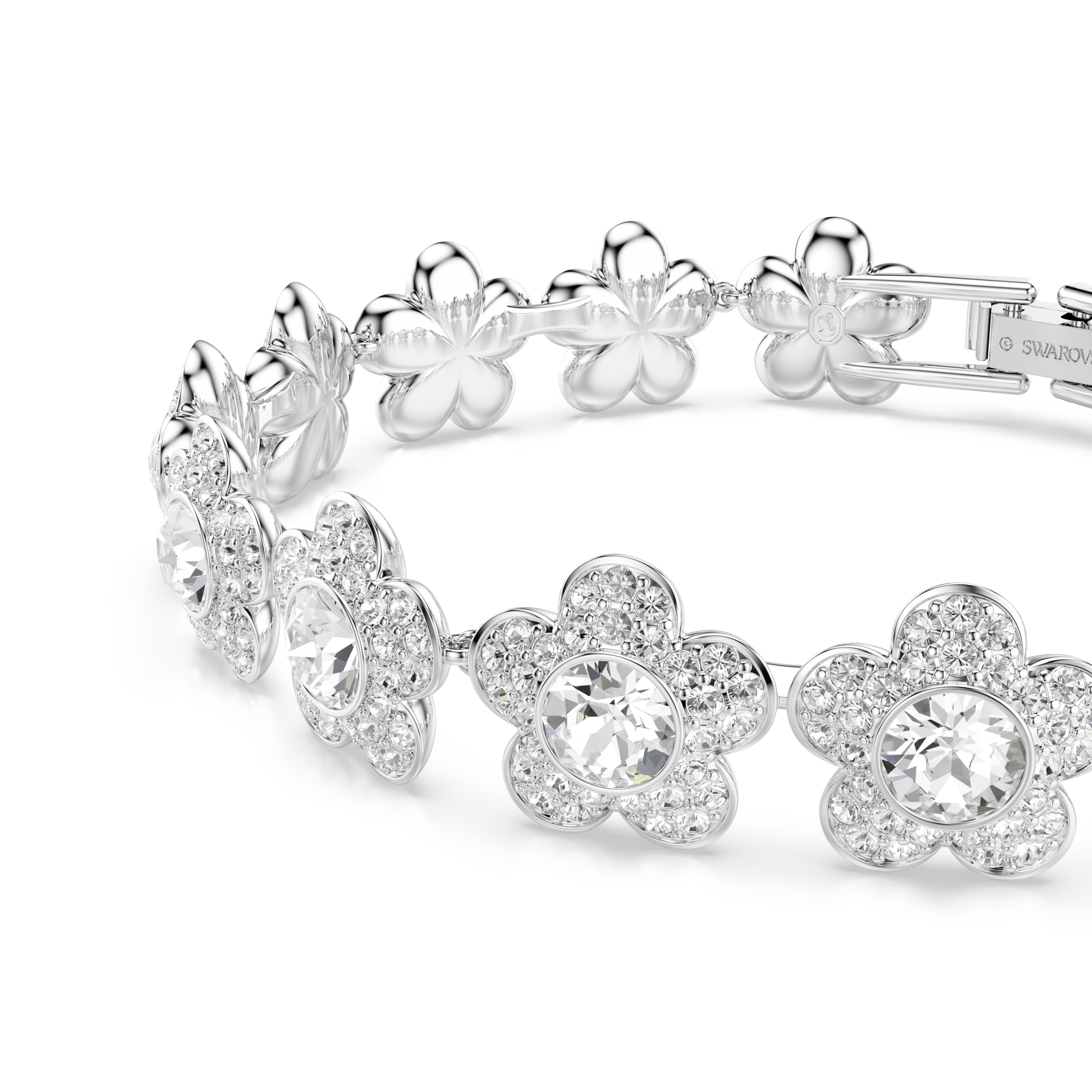 Poput blistavog lanca od bijele rade, ova narukvica koja reflektuje svjetlost krasi niz nježnih cvjetova sa svih strana, svaki napravljen sa kristalnim središtem i laticama ukrašenim blistavim paveom. Dizajn prožet prirodom idealan je za svakodnevni luksuz i može se nositi sa odgovarajućom ogrlicom za bezvremensku kombinaciju.