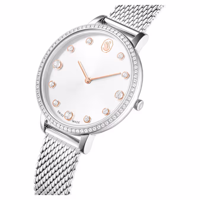 Ovaj elegantni sat marke Clarica odlikuje se svojom prepoznatljivom narukvicom, koja pruža upečatljiv mrežasti stil oko zgloba. Dizajn od 35 mm izrađen je od nerđajućeg čelika i ima savršeno kružni okvir ukrašen sa 73 providna kristala. Na brojčaniku sa sunčevim zracima, sat otkriva 11 kristalnih indeksa, logo labuda na 12 sati i kazaljke boje ružičastog zlata. Ovaj sat proizveden u Švajcarskoj je vodootporan do 50 metara i nudi klasičan izbor za svakodnevni luksuz.