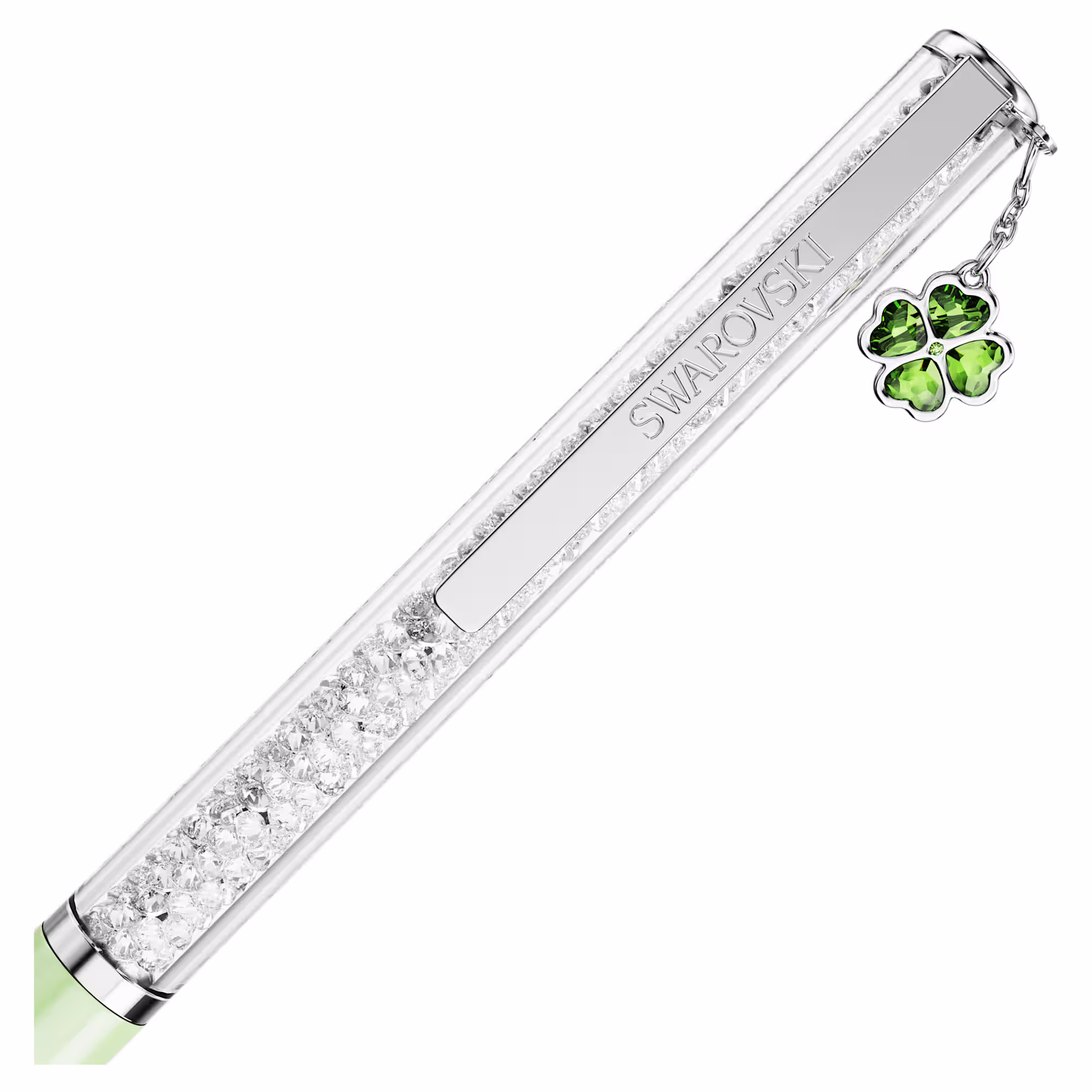 Ova vitka hemijska olovka nudi bezvremenski dodatak za beskrajnu kreativnost. Tanki dizajn je ispunjen sa oko 400 providnih kristala, koji su vidljivi kroz dugačak providni prozor. Uz lakirano zeleno tijelo, olovka ima hromiranu završnu obradu, kao i privjesak u obliku djeteline za sreću, koji simbolizuje nadu, vjeru, ljubav i sreću. Poklon sebi ili nekome koga poznajete ko ima poetični način pisanja riječima. Dopunske filtere crnog i plavog mastila možete kupiti u Swarovski prodavnicama.