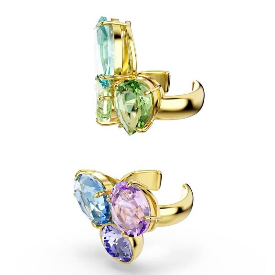 Swarovski Gema asimetrične kristalne naušnice. Gema naušnice su zapanjujući par visećih dragulja u toploj pozlaćenoj završnoj obradi, koje zrače luksuzom i sofisticiranošću. Ukrašene blistavim Swarovski kristalima, naušnice prelijepo hvataju i reflektuju svjetlost, privlačeći pažnju svakim pokretom. Kristali vise odmah ispod režnja, dodajući graciozan, upečatljiv izgled koji savršeno upotpunjuje svaku elegantnu odeću.
