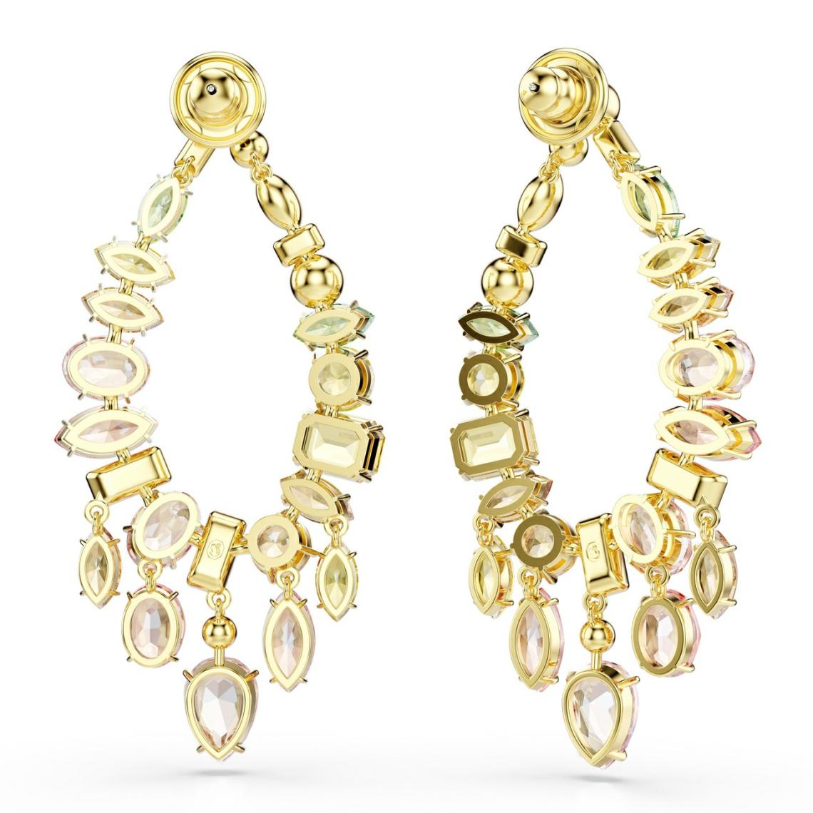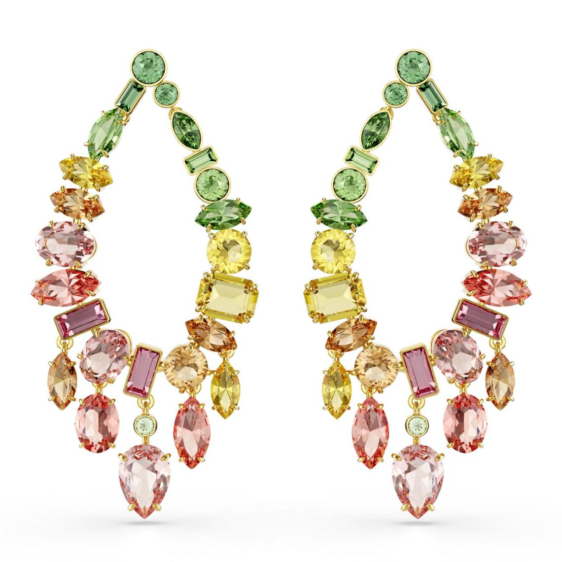 Dizajnirane za žene, ove naušnice imaju prelijepu višebojnu nijansu. Izrađene od pozlaćene zlatnom presvlakom, mogu se pohvaliti sofisticiranom i sjajnom završnom obradom. Šarm ovih naušnica leži prvenstveno u Swarovski kristalima koje sadrže. Ovi kristali briljantno blistaju, čineći ove naušnice pravim draguljem za nošenje. Ovaj jedinstveni dizajn kombinuje eleganciju i glamur, savršen za upotpunjavanje svake odjeće.
