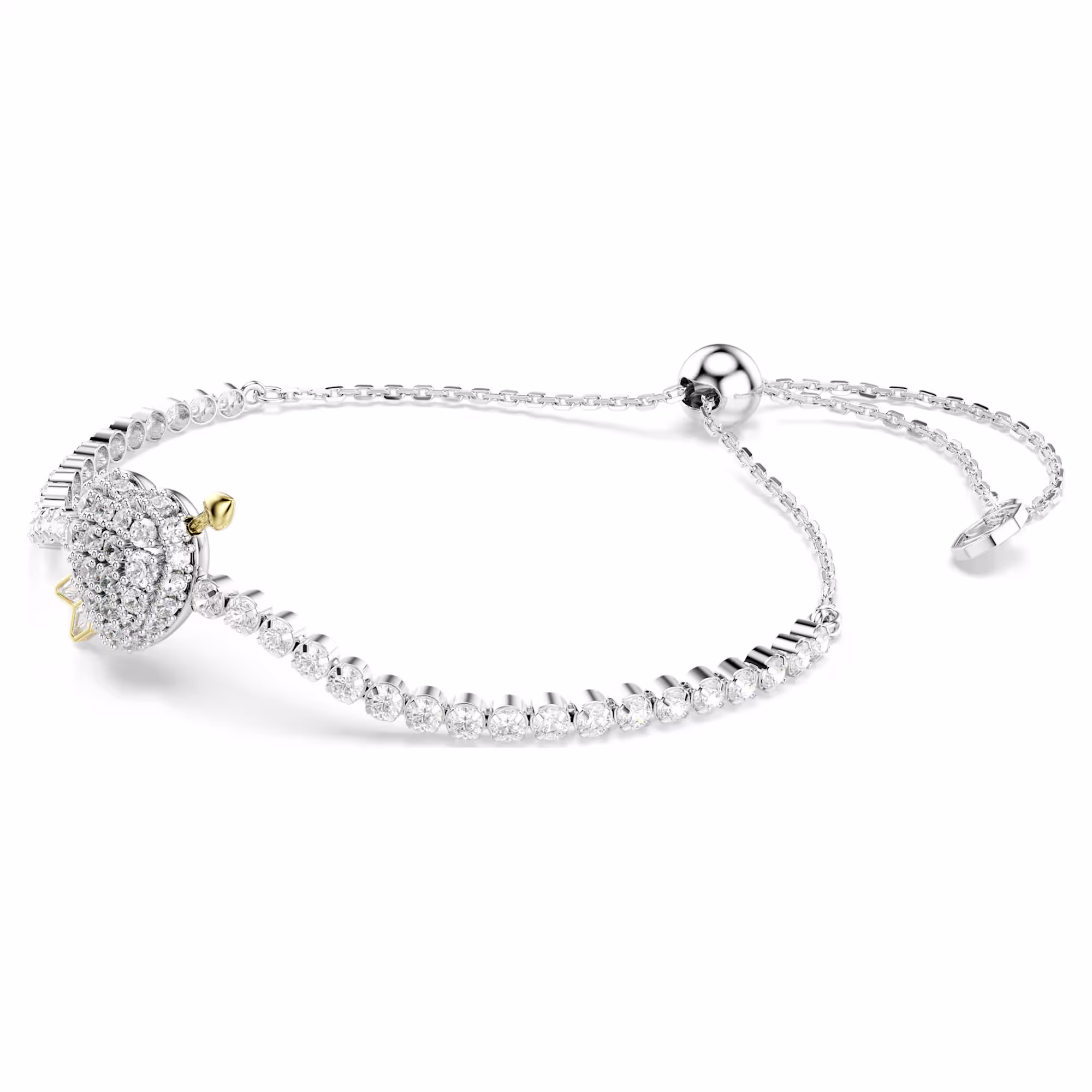 Prava ljubav susreće blistavu svjetlost u ovoj Swarovski narukvici iz porodice Idyllia. Meki lanac je obložen okruglim kristalima u rodijumskom oknu, dok je u sredini, blistavi motiv srca probijen Kupidonovom zlatnom strelom. Prilagodite veličinu svojoj veličini pomoću kliznog zatvarača i uparite narukvicu sa drugim odgovarajućim nakitom iz iste linije inspirisane romantikom.