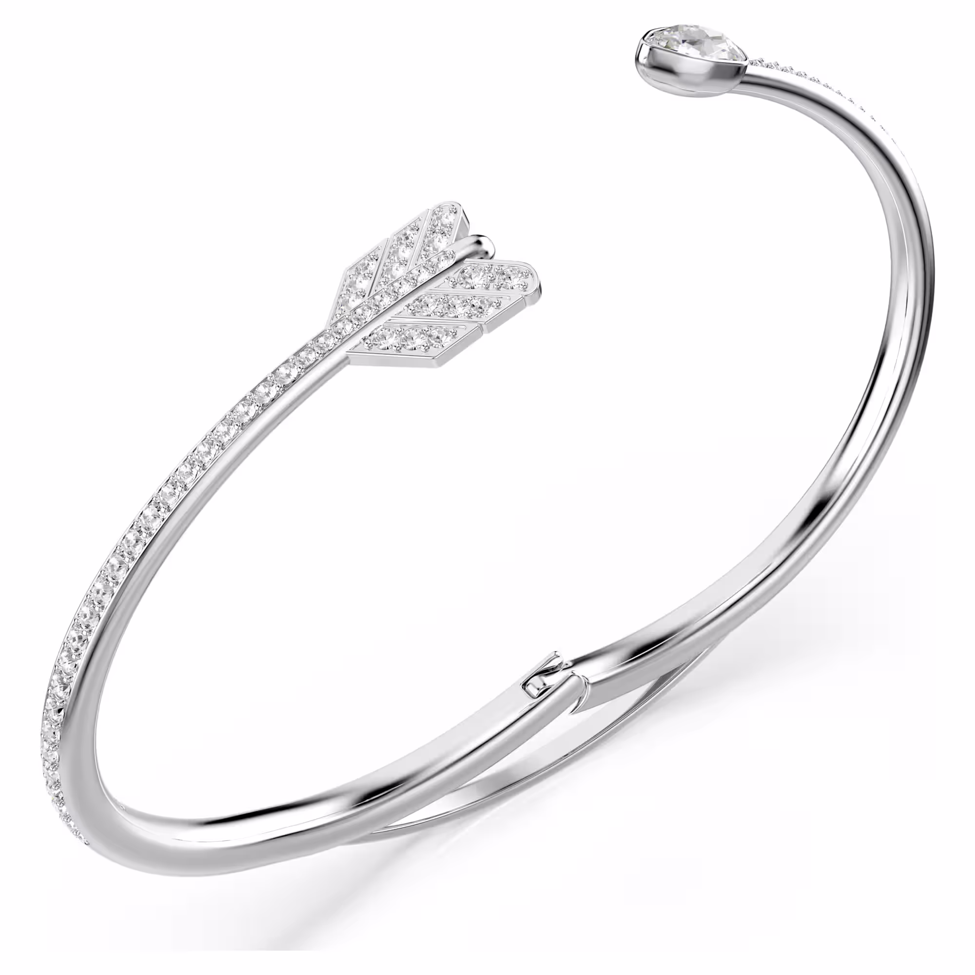 Umotajte svoj stil u romantiku ovom narukvicom sa rodijumskim premazom, inspirisanom Kupidonovom strijelom. Dizajn je ukrašen providnim kristalima za maksimalan sjaj, dok šarka na poleđini olakšava stavljanje i skidanje. Jedinstveni dodatak koji će svaki izgled osvojiti ljubavlju.