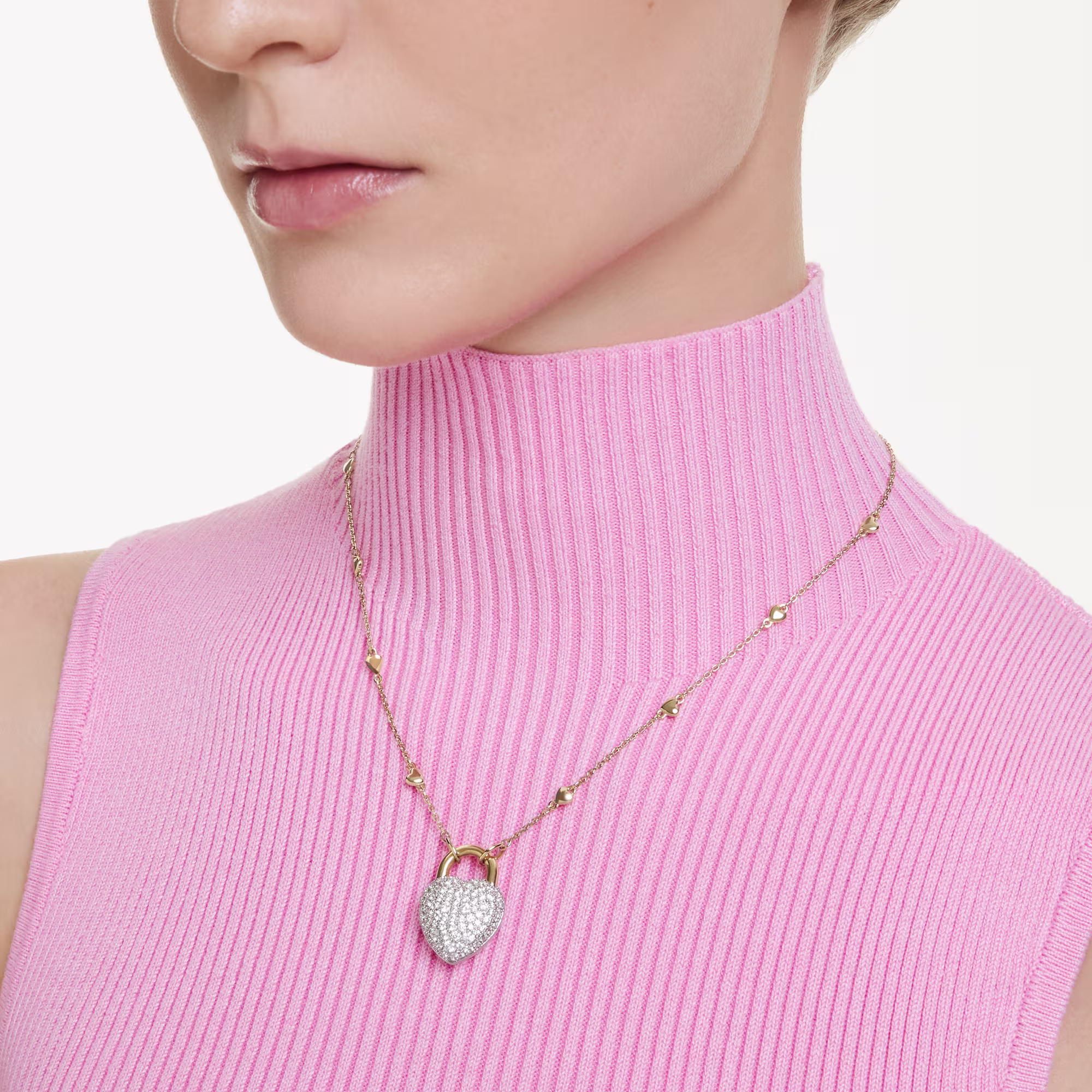 Simbolizujući tajne ljubavi, ovaj romantični privjesak ima motiv srca inspirisan medaljonom, koji se lako može okrenuti na dva različita načina. Sa jedne strane, površina pozlaćena rodijumom sa jednim kristalom u obliku srca, a sa druge strane, blistavi ambijent Swarovski kristala u stilu čatonaža. Motiv je okačen na nježnom lancu zlatne boje, koji je ukrašen malim perlicama u obliku srca.