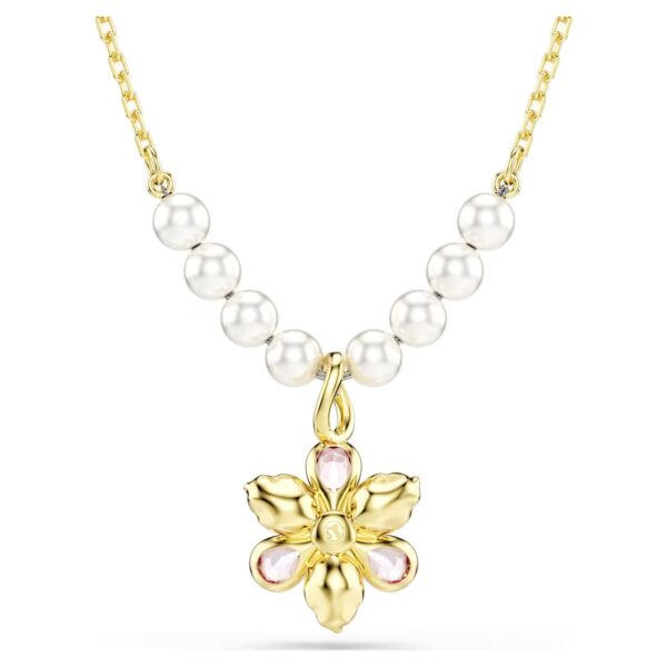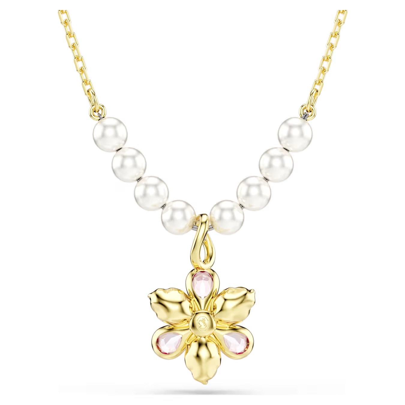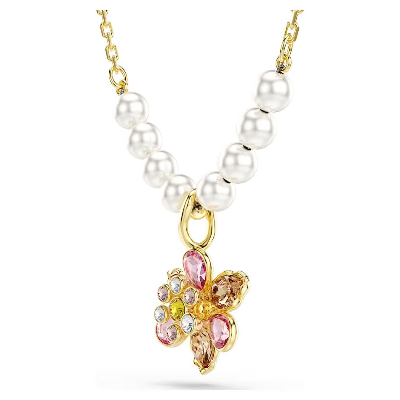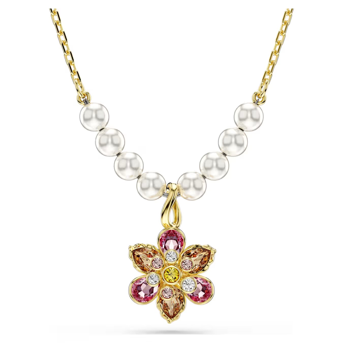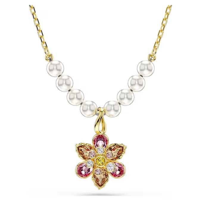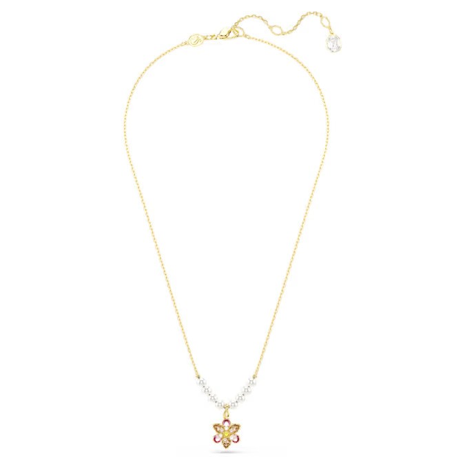 Ovaj šarmantni privezak dodaje magičan i prirodan dodir svakoj odeći. Lanac pozlaćeni zlatnom bojom sadrži osam Swarovski kristalnih bisera, elegantno postavljenih sa obje strane jednog cvijeta, koji je vješto izrađen od kristala u različitim brušenim i nežnim bojama. Nakit uključuje zatvaranje u obliku jastoga i produženje za podesivo prianjanje. Divan luksuzni poklon za ležerno svakodnevno nošenje.