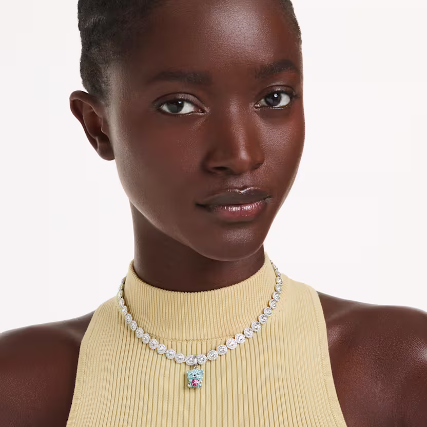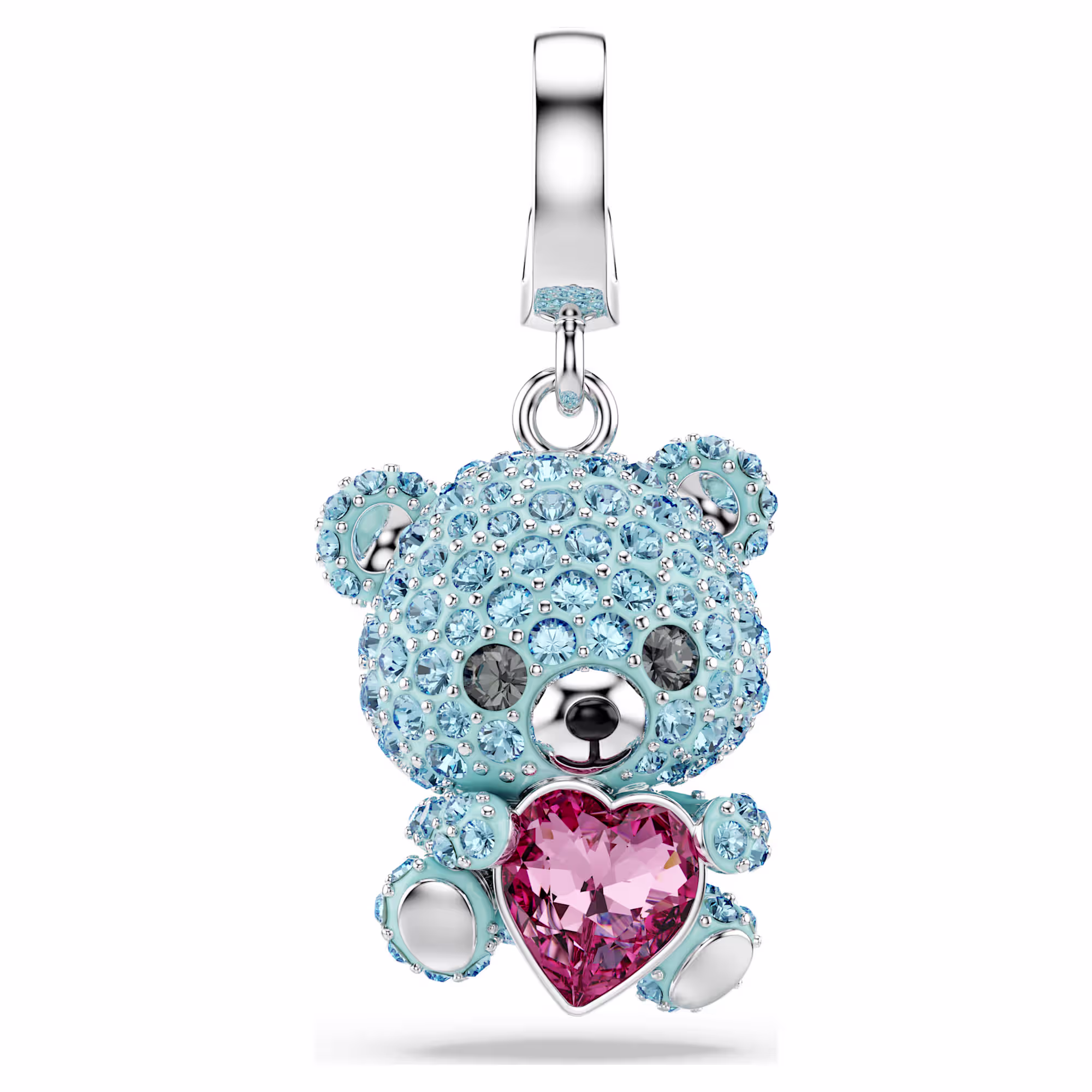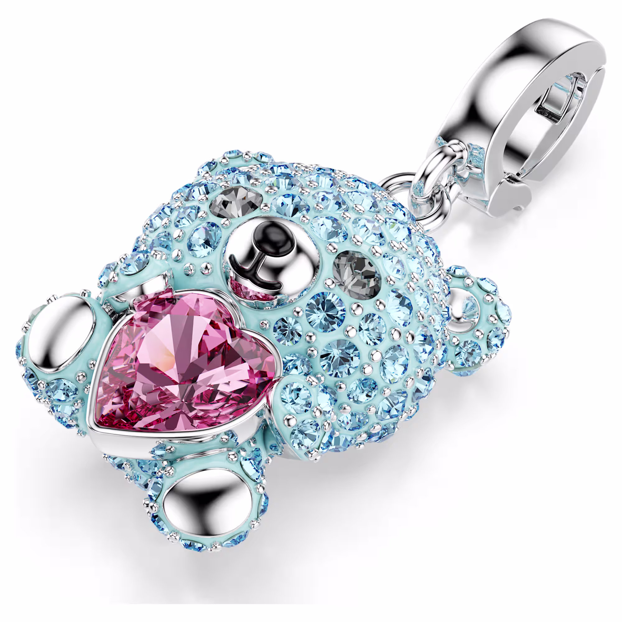 Dodajte radost svom nakitu ovim razigranim privjeskom u obliku plišanog medvedića. Izrađen od rodijumske pozlate, privezak je ukrašen plavim paveom i uključuje ružičasti kristal u obliku srca za romantičan dodir. Kopča po mjeri vam omogućava da nosite privjezak na raznim ogrlicama i narukvicama.