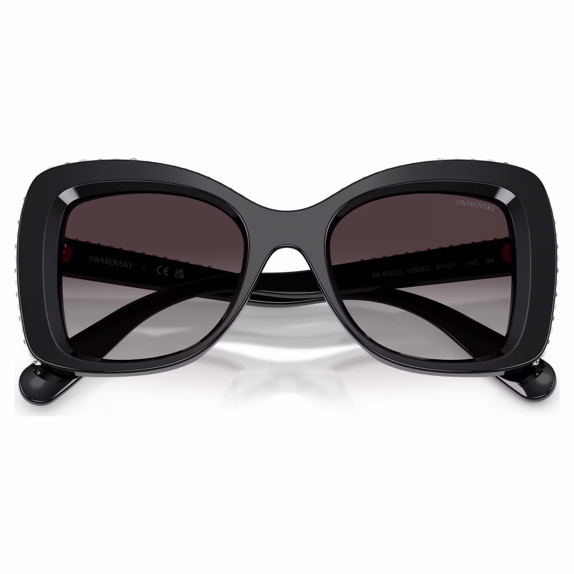 Sa svojom velikom veličinom i luksuznim dekorom, ove Swarovski sunčane naočare daju dašak holivudskog glamura. Crni okviri u obliku leptira obogaćeni su naizmeničnim providnim kristalima i bijelim Swarovski kristalnim biserima i imaju tamno siva sočiva za klasičnu sofisticiranost. Nosite ih bilo kada da biste ostavili smeo stilski izraz.